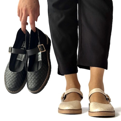 Baletas negras estilo Mafalda con diseño trenzado y correa ajustable. Elegantes, cómodas y atemporales, perfectas para un look clásico con personalidad.