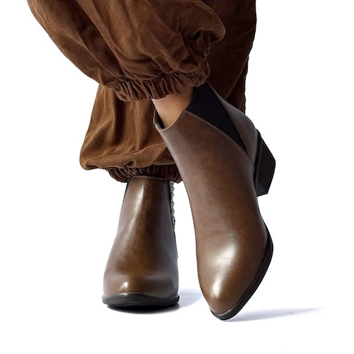 Los botines con inspiración texana en tono café combinan carácter y elegancia. Su diseño con detalles de taches y acabado en textura que imita el cuero envejecido los convierte en un básico versátil para looks modernos y sofisticados.